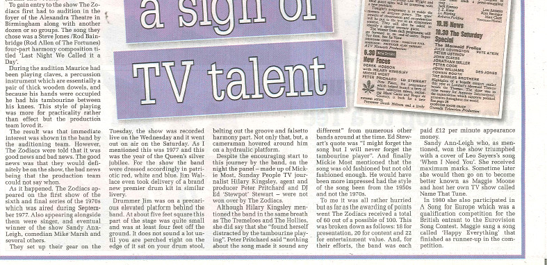 As it happened, The Zodiacs appeared on the first show of the sixth and final series of the 1970s which was aired during September 1977. Also appearing alongside them were singer, and eventual winner of the show Sandy Ann-Leigh, comedian Mike Marsh and several others.
