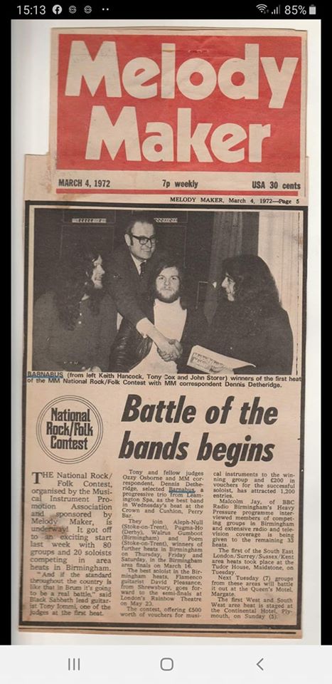 During March 1972, Barnabus gained a major breakthrough by winning the Midlands heat of the Melody Maker Rock & Folk contest. The competition, held at the Crown and Cushion in Perry Barr, Birmingham, was significant because the judges had ben Ozzy Osbourne and Tony Iommi of Black Sabbath fame. After Barnabus had performed ‘Winter Lady’ live both Tony and Ozzie stood up and applauded. They shook hands with the band telling them how great their music was and that their standard was very high.